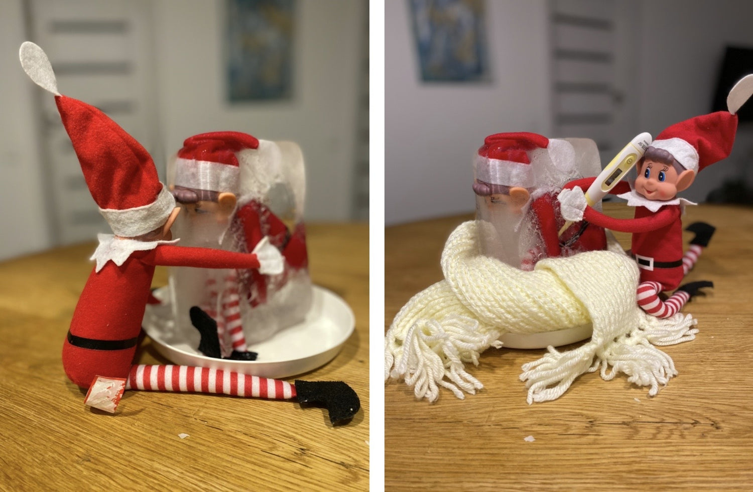 Jums reikės bet kokios formos indelio ir vandens. Pasodinkite Elfą į indelį, užpilkite vandeniu ir į kamerą. Na o išėmus reikia imtis visko, kas tik galėtų padėti atšilti. Gali pasitarnauti: šalikas, kepurė, plaukų džiovintuvas, žvakės, arbata ir pan. P.S. Prieš darant šią išdaigą buvo neramu koks gi liks Elfukas, bet viskas pavyko puikiai, Elfas sveikas, nepakitęs :)