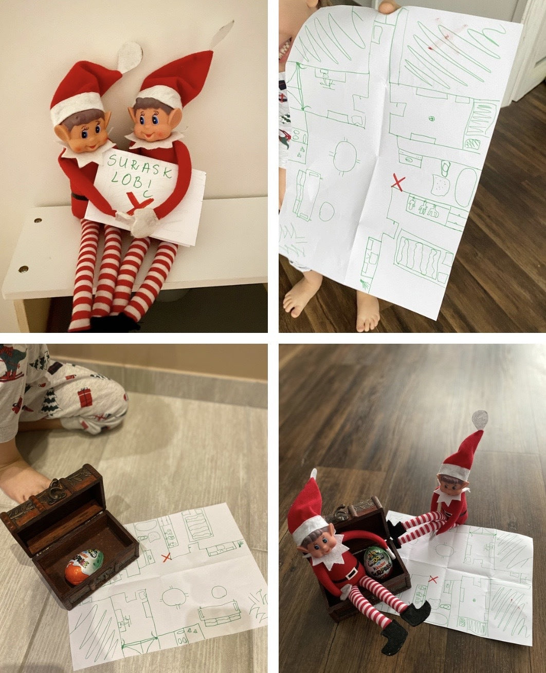 Elfai gali palikti ne tik išdaigą, bet ir užduotėlę. Šiuo atveju užduotis - surask lobį. Paimkite popieriaus lapą ir plius minus nubraižykite orientacinį planelį, kur ieškoti paslėpto lobio, šiuo atveju kinderio.