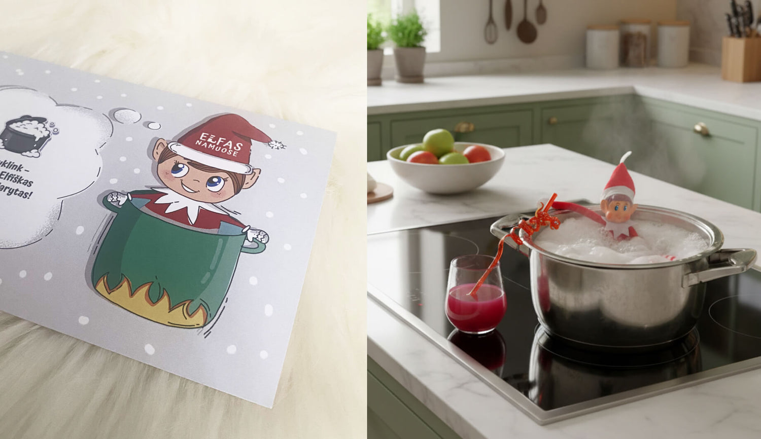 Idėja: Elfas atsineša sausainių formelę. Ir pradeda darbuotis su miltais... Elfas padaro didelę betvarkę bet jam nepavyksta iškepti sausainių. Todėl siūlome šią užduotį iki galo atlikti vaikučiams kartu su tėveliais ir iškepti nuostabiai kvepiančių sausainių :).