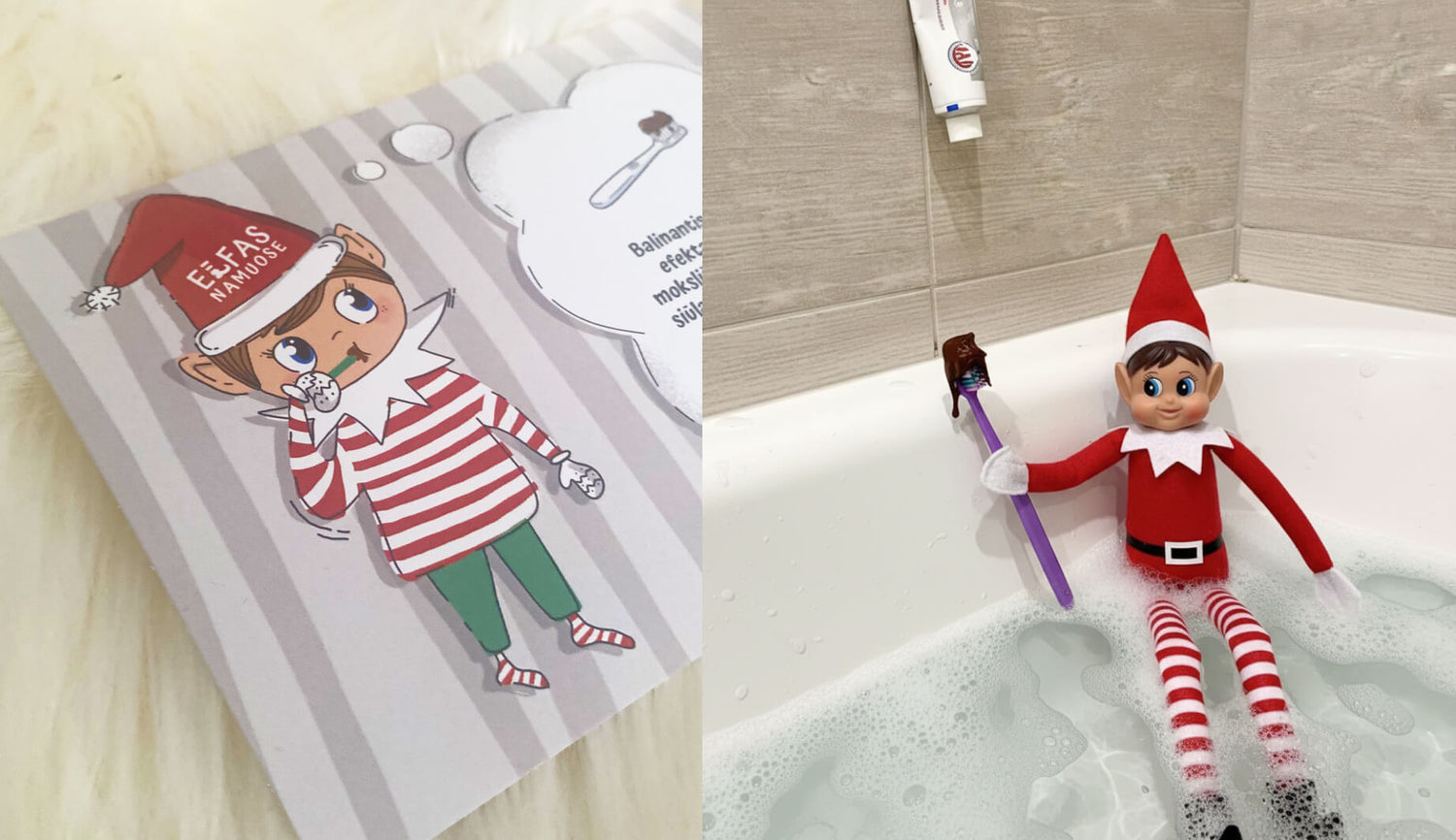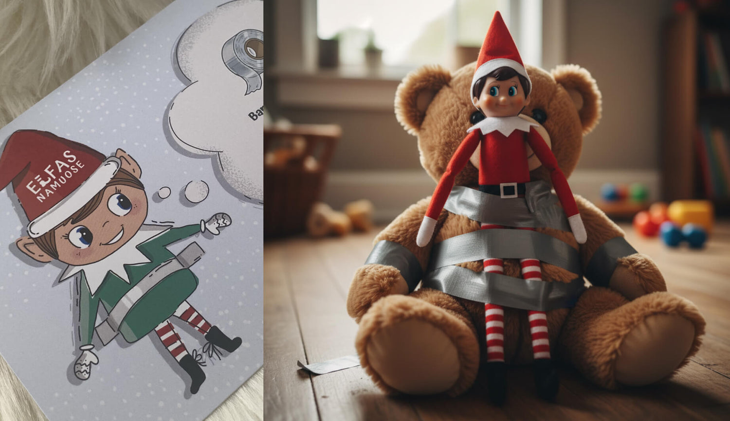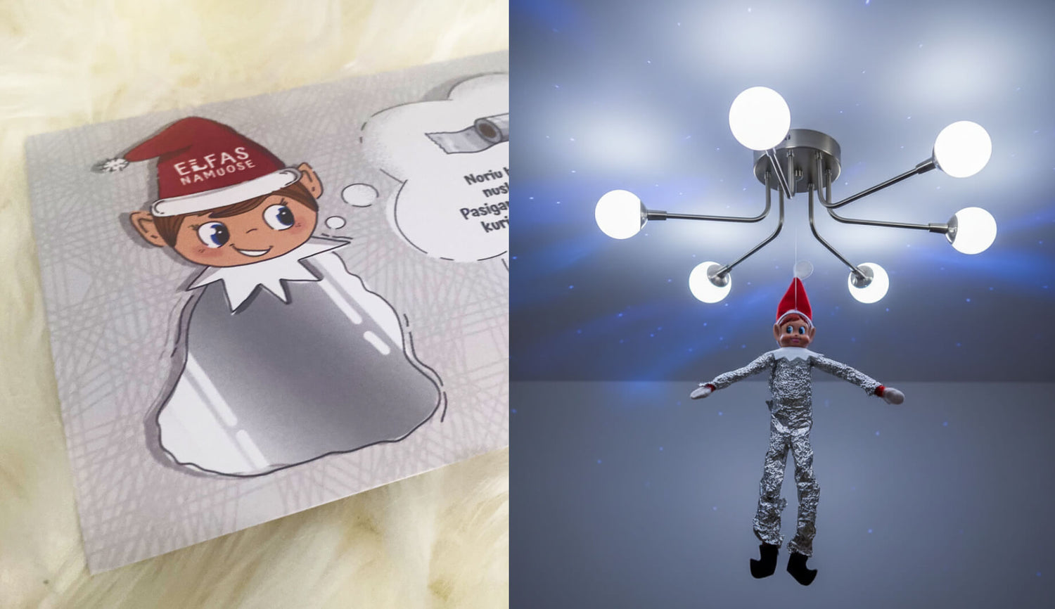 Idėja: pas jus jau yra kalėdinė eglutė? Elfas ją tobulina ir pats pakliūva į lempučių pinkles... Bet tuo pačiu atneša savo magišką žaisliuką (jeigu pirkote Elfas Namuose rinkinį). Žaisliuką galima nuspalvinti ir dekoruoti.