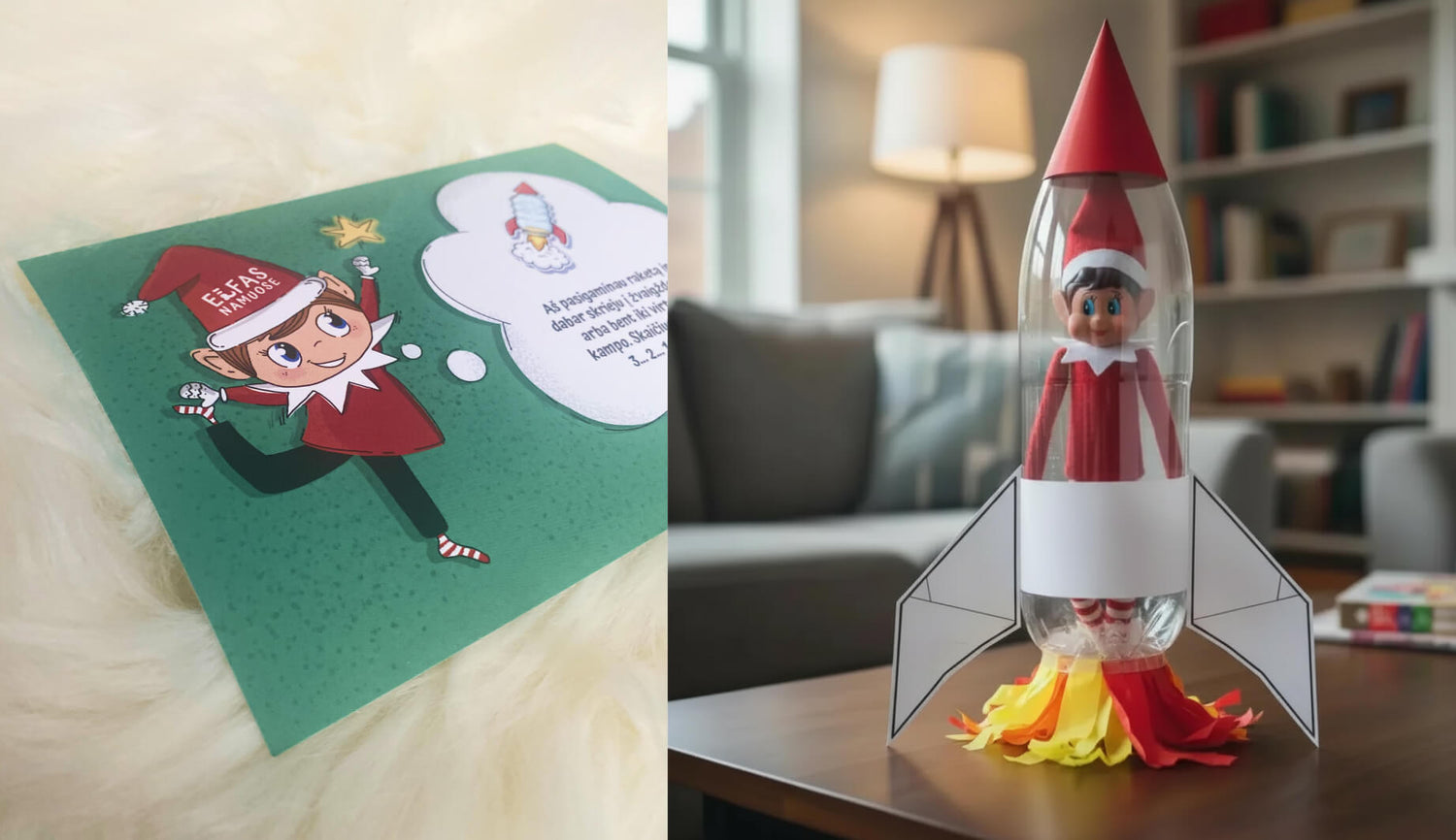 Idėja: perpjauname buteliuką idedame Elfą, o sujungimą apklijuojame lipnia juosta ir popieriumi. Papildomai galite pagaminti raketai sparnus.
